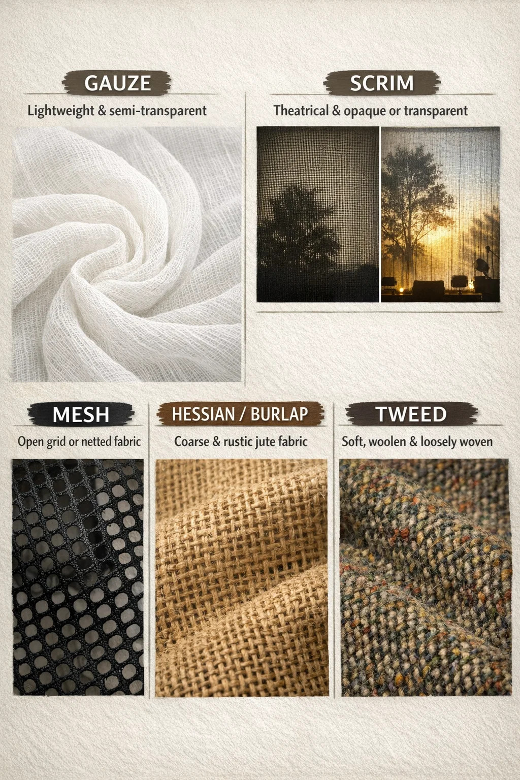 Structural characteristics: This fabric has large gaps between the warp and weft threads, making it semi-transparent and very lightweight.
