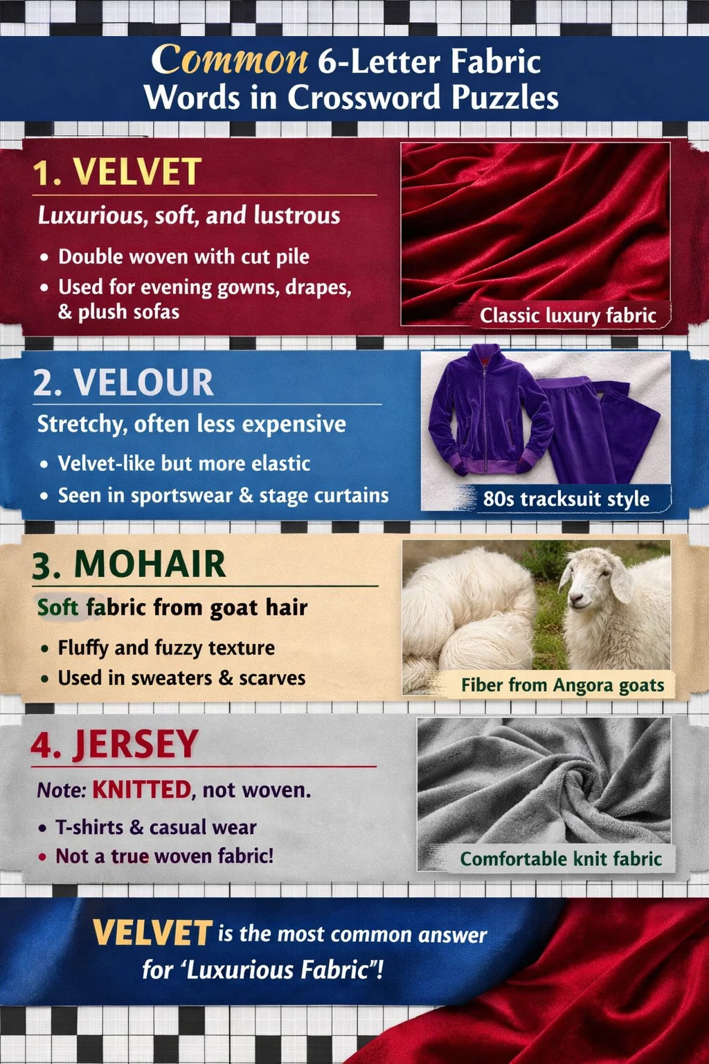In crossword puzzles, if the clue describes a "luxurious, soft, and velvety" 6-letter woven fabric, the most classic answer is VELVET.