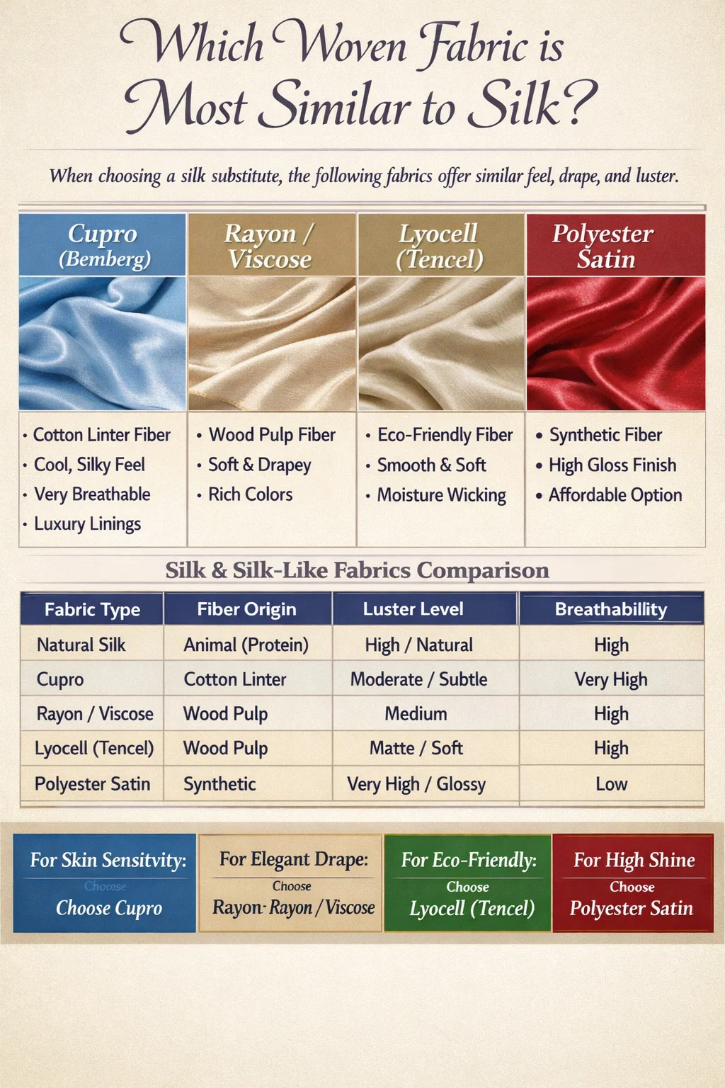 When searching for a woven fabric that replicates the luxurious feel, luster, and drape of natural silk, the most prominent contenders are Rayon, Cupro, and Lyocell (Tencel). Among these, Cupro is widely considered the closest match in terms of breathability and silken touch, while Satin-weave Polyester serves as the most common affordable synthetic alternative. These fabrics utilize specific weaving techniques to mimic the smooth protein fibers produced by silkworms.